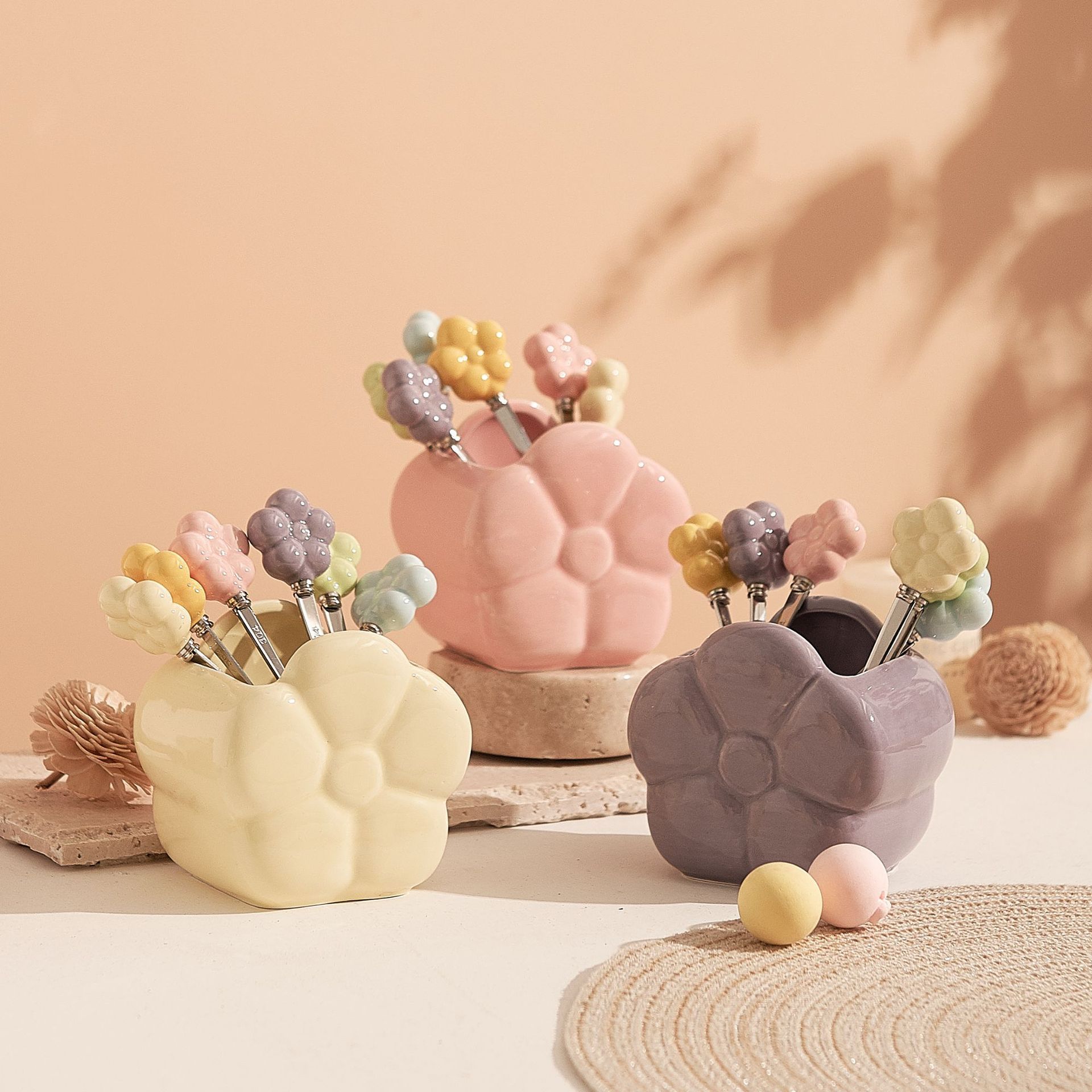 Specifications: cream yellow (1 can with 6 Forks mixed colors), yellow (1 can with 6 Forks mixed colors), blue (1 can with 6 Forks mixed colors), Purple (1 can with 6 Forks mixed colors), pink (1 can of 6 Forks mixed color), fruit Green (1 can of 6 Forks mixed color), cream yellow jar, cream yellow fork, cream yellow spoon, yellow jar, Yellow Fork, yellow spoon, Blue Jar, blue Spoon, blue fork, Purple Jar, purple fork, purple spoon, pink jar, pink fork, pink spoon, fruit green jar, fruit Green fork, fruit Green Spoon